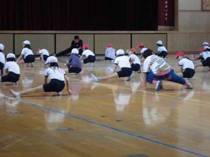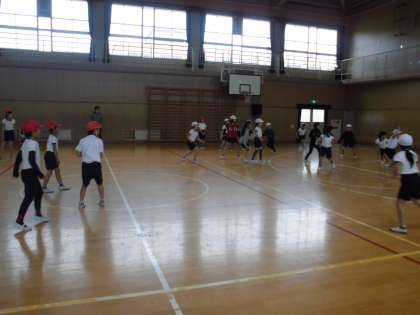 最初に並び方の確認と準備運動を行い、オニゴッコで動いた後、最後はクラス対抗のドッジボールで盛り上がりました。