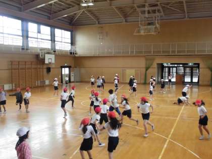 今日から授業も始まり、給食を食べた後、5時間目は1組と2組で合体を行いました。