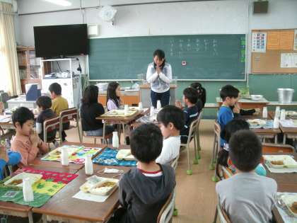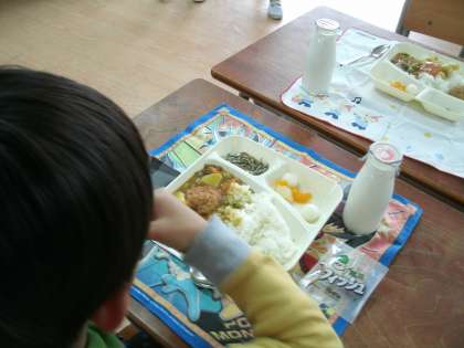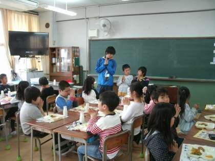 今日から給食が始まりました。今日の献立は、『入学お祝い給食』。多くの子ども達が大好きなカツカレーとデザートでした。久しぶりに友達と給食を食べると、話に花が咲いて、とてもにぎやか。楽しく食べることができました。また、好物だったのでぱくぱくもりもり。