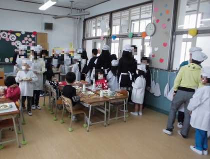 また、初めての給食も経験しました!初めての給食のメニューはカツカレーです。6年生のお兄さんお姉さんがお手伝いしてくれて、準備の仕方を教わりました。優しい6年生と一緒に過ごし、ニコニコ笑顔が溢れました!
