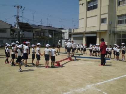今週は、春とは思えない寒い日があったり、風の強い日があったり…。でも今日は、春本番を思わせる天気のよい陽気な日となりました。その中で体育をしました。