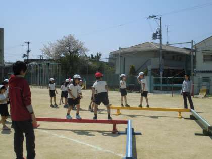 新学期が始まってまだ間がないということで、体をほぐす運動を中心に行いました。鬼ごっこをして体を動かしたり、平均台を使って運動したり…。