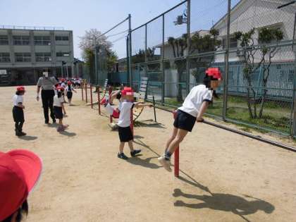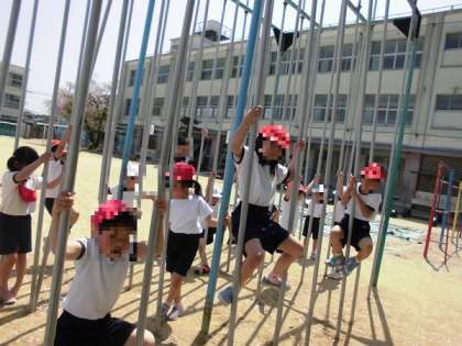 楽しい準備体操が終わった後は、みんなでおにごっこをしました!おにも逃げる側も、広い運動場で思いきり走り回りました!またのぼり棒や鉄棒にも挑戦し、使い方を学ぶことができました!