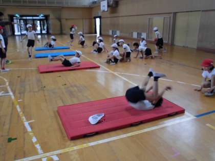 マット運動では、後転が苦手でも挑戦しようとする姿が多く見られました。