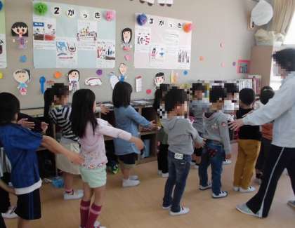 発育測定が終わり子どもたちの背の高さがわかったので、いよいよ背の順の並び方に挑戦しました!上手に背の順に並んだあとは、2列の並び方に挑戦です!新しくおとなりに並んだお友達を、しっかり覚えましょう!