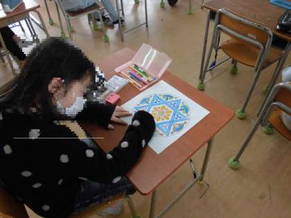 今日の4年1組の図工では、まんだらぬりえの仕上げを行いました。