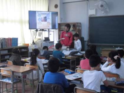 自己紹介カードが完成すると、書画カメラで写し、大型テレビに映してみんなの前で発表しました。