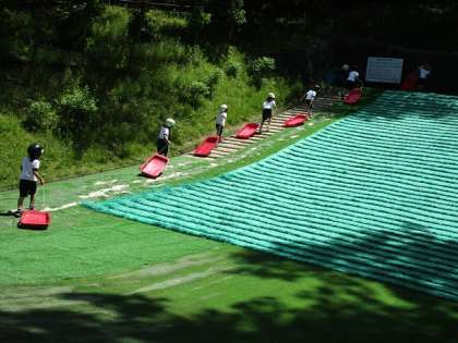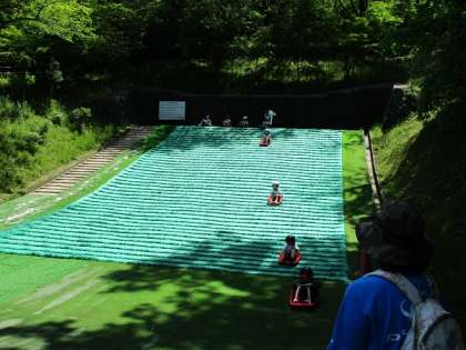 中でも大人気だったのが「ちびっこゲレンデ」です!ヘルメットをつけて、1人2回ずつ草すべりをしました!
