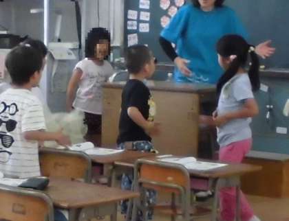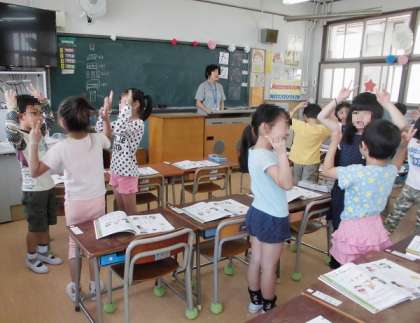 音楽では、みんなで歌を歌いながらじゃんけんしました。教室をぐるぐるとまわり「じゃんけんぽん」の掛け声で近くの友達とじゃんけんをします。大きな声で歌を歌い、楽しく学習することができました!