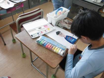 マイネームペンで描いた下描きに、絵の具で色を塗っていきます。少し塗っては余分な水分を雑巾で吸い取って、また塗っていく細かな作業を根気強く続けている子がいます。薄めの絵具を大胆に塗っている子もいます。一人一人が工夫して、自分の似顔絵を仕上げていました。