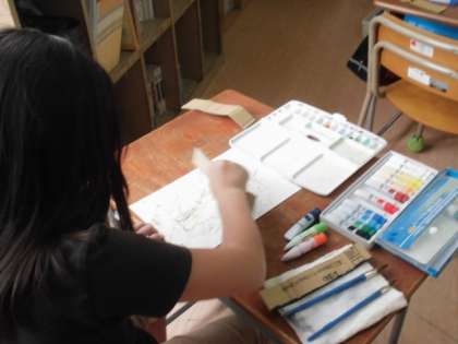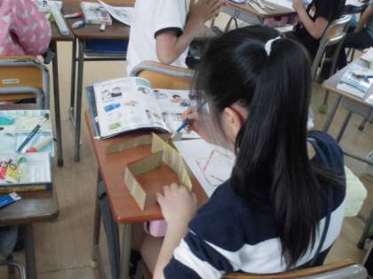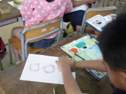 図工では、自分の似顔絵作成の後、段ボールの断面を使って模様を描いています。