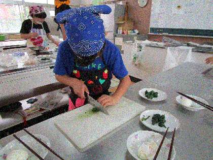 5年生初めての調理実習は、ゆで卵とほうれん草をゆでる調理をしました。ゆで卵の調理では、黄身の固さを調整するため、5分、10分、15分と時間を測りながらゆでていました。ほうれん草の調理では、沸騰したら根から入れること、同じ大きさに切ることなどに注意しながら取り組みました。どの班も協力して仲良く取り組みました。
