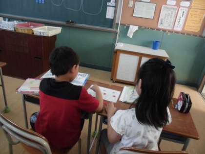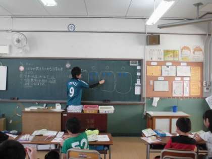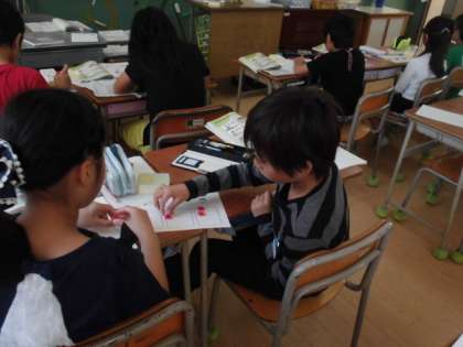「12個のクッキーを3人で同じ数ずつ分けます。1人分はいくつですか?」という問題に対して、自分達の生活経験の中から、多くの子ども達がさっと答えを導き出していました。その後、ペアになっておはじきを使って確認しました。そして、式に表し、わり算の計算について理解を深めていきました。