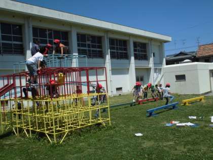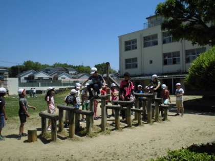 今日が業間体育の最終日。アスレチックやジャングルジム、平均台を使って運動しました。