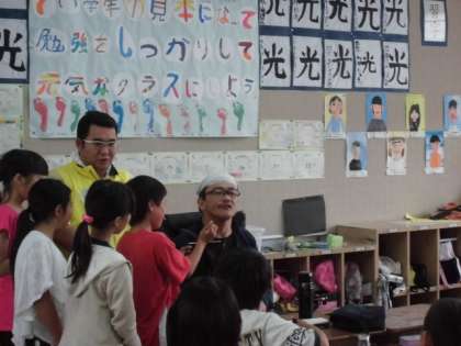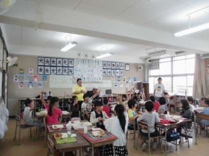 4時間目の学習が終わる頃、職員室前には赤おにさんの姿が。そして、しばらくすると、授業を終えた代表の子が赤おにさんを迎えに来て、教室まで案内します。そして、給食の準備が整うと、本格的に交流給食が始まります。