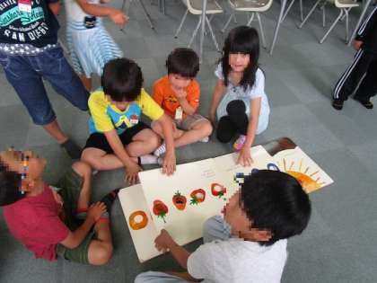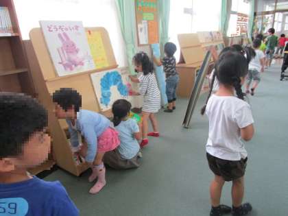 普段短い時間しか行けない図書室にたくさん行くことができて、子どもたちはとても楽しそうな様子でした!好きなシリーズの本を何冊も読んだり、上の学年のお兄さんお姉さんに絵本を読んでもらったりと、楽しく雨の日を過ごすことができました!