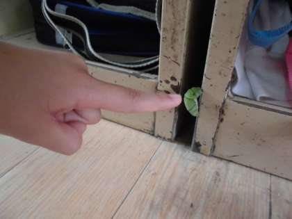 1組の下駄箱の上に3匹のアゲハの幼虫を飼育していました。がしかし、とても不思議です。1匹は傘立てのところで、もう1匹はなんと教室内のロッカーのところでさなぎになっていました。もにょもにょとゆっくり動く幼虫なのに、どのように移動したのでしょう?(1匹は現在行方不明です。)