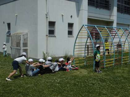 芝生の緑が映えるアスレチックでは、「たけのこぬき」「だるまさんが転んだ」「ゴム跳び」などをして、なかよし班での交流を深めました。