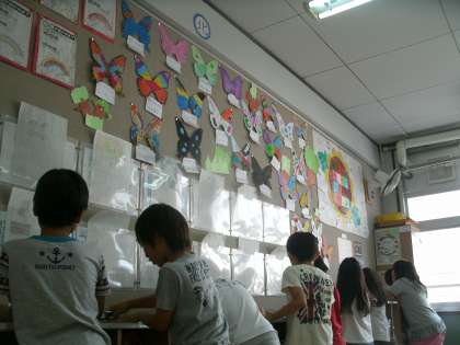 今日は、教室に掲示している『世界に1つだけのチョウ』で、互いに伝え合いをしました。