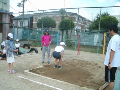 砂場では立ち幅跳びをしました。膝を曲げ、腕を大きく振って「いち・に・の・さん!」大きなフォームでばねのように跳んでいました。