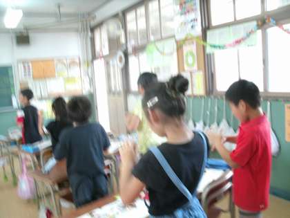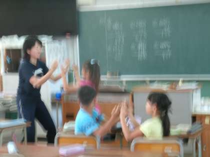 『茶つみ』では、友達とペアになって、動きを付けて歌いました。はじめはリズムがゆっくりだったのでひっかからずにできましたが、リズムが速くなると友達とのコンビネーションが乱れて引っかかってしまう子が続出しました。でも、みんな、一生懸命楽しく歌い、音楽に親しんでいました。