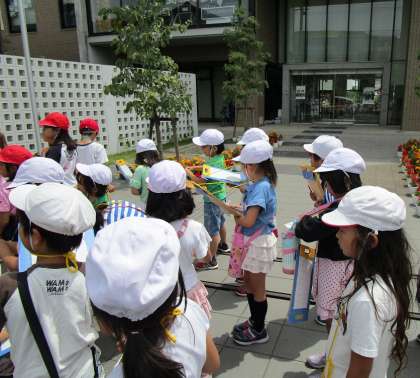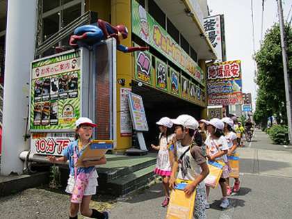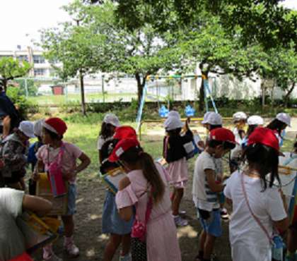子どもたちが普段遊んでいる公園に行ったり、長居公園通りに並ぶお店にはどんなお店があるのだろうと言いながら歩いたり、「中学校にはこんな広い運動場があるんや!」と驚いたり・・・。暑さにも負けず子どもたちは笑顔で歩を進めていました!