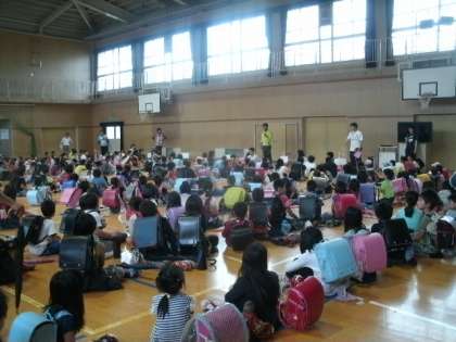 避難訓練の際に、朝会の隊形で集合・整列していたので、まず、地区ごとの隊形に並び替えました。そして、担当の先生から集団で下校する時の注意点を聞き、順番に下校しました。家に着くまでの間、安全に帰ることができるように、気をつけなくてはいけないことを確認しながら家路につきました。
