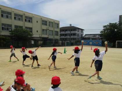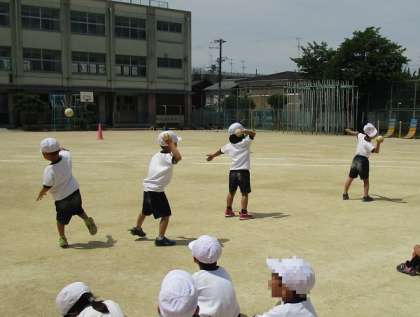 1年生ではソフトボール投げの測定に向け、ボールを投げる練習を行っています。暑くてヘトヘトになりながらも、より遠くへ投げるために、子どもたちは一生懸命頑張っていました。