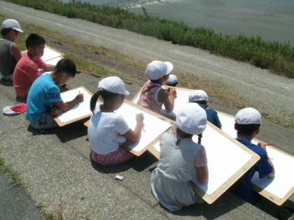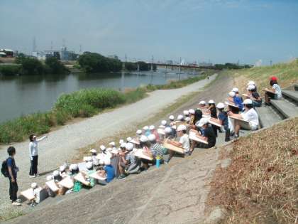 今日の2・3時間目、大和川に絵を描きに行きました。担任から説明を聞いた後、早速自分のお気に入りの場所を探して描く準備OK。両手の親指と人差し指を使って四角い窓を作り、そこから景色を覗いて、どこを描くか決めました。