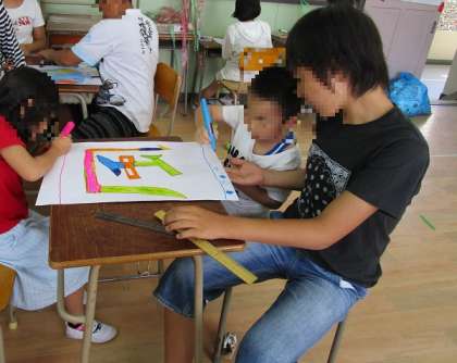 お兄さんお姉さんに教えてもらいながら、看板の文字に色を塗ったり、飾りを作ったりしました!大好きな5、6年生のお手伝いができて、にこにこ笑顔の1年生でした!
