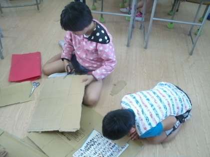 『魚つり』をする1組の教室を覗くと、魚を作っていました。いろいろな魚の絵が描かれたものを参考に、ていねいに段ボールに描き写していました。