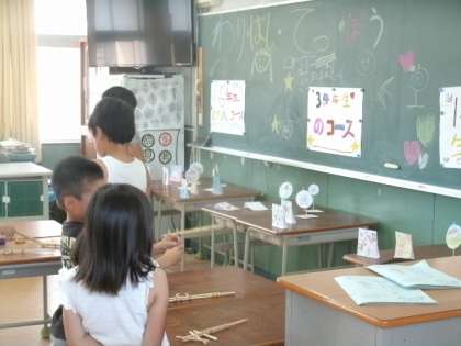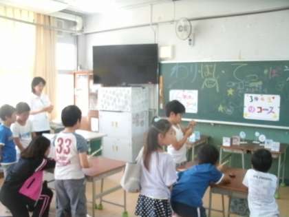 1組のお店は『わりばし鉄砲』です。お店に入ると、黒板がカラフルに彩られ、お店の雰囲気を高めていました。低学年コース、中学年コース、高学年コースと、どの学年の人が回ってきても楽しめるようにコース設定がされていて、おもてなしの気持ちが伝わってきました。