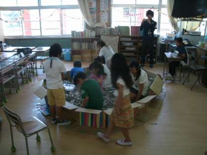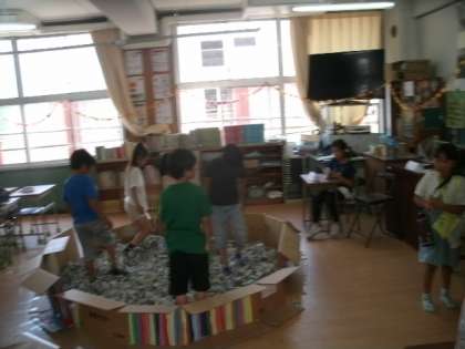 2組のお店は『宝探し』でした。お店に入ると、雰囲気を高めようとBGMが流れていました。そして、真ん中にどか〜んとお宝を隠す池(?)がありました。よくこれだけたくさんの新聞紙を用意したなと感心するくらいの新聞紙が中に入っていて、簡単にはお宝を探し出すことができないように工夫がされていました。