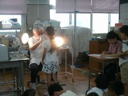 口を大きく開けると、校医先生の優しくも鋭いまなざしが子ども達の口の中に。虫歯や歯ぐきの病気があっては大変ですからね。少し難しいアルファベットや数字が次々に言われ、保健の先生が記録していきます。検診が終わると校医先生にお礼を言って保健室を出ていく子ども達。