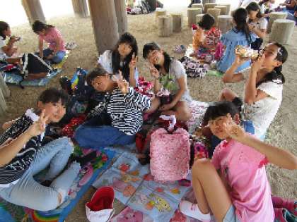 お昼は、近くの池上曽根史跡公園内の「掘立柱建物」という大きな建物の下でいただきました。天気もよく、大変暑い中でしたが、大きな屋根が日かげとなっていて、とても涼しく感じられ、美味しくいただくことができました。食後は、その建物の2階も見学し、こちらも有意義な時間となりました。