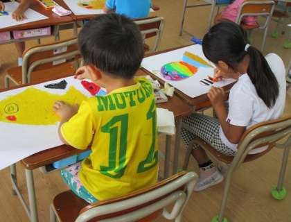 図工の時間には、引き続きおさかなの絵を描いています。この絵は「大和川にこんな魚がいたらいいな。」とイメージしており、個性的なおさかながいっぱい出来上がりました!