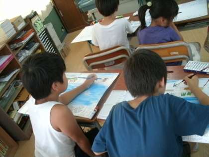 今日はむしむしと、梅雨らしい蒸し暑い日となりました。こういう日にこそ、さっぱりしたい、ではなくて、泳力向上のためにプールに入って、水泳学習に励みたいところです。しかし、残念ながら雨が降り、プールに入ることができませんでした。そこで、1組は大和川の絵の色塗りを始めました。