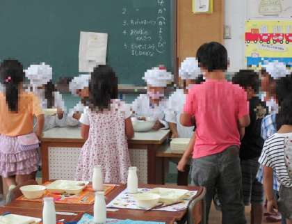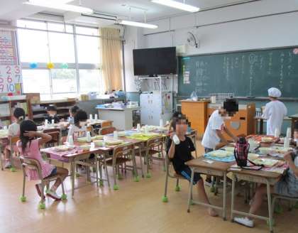 最初は6年生に手伝ってもらっていた給食の用意も、今ではとても上手に用意できるようになりました!ご飯やおかずをよそうのも、ほとんどこぼさずにできるようになりました!いただきますのあいさつも、とっても大きな声が響きます!
