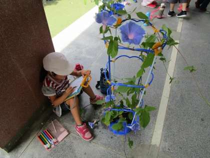 きれいに咲いたあさがおの、花とつぼみをよく見てかきました!花はラッパみたいな形をしているね、つぼみはロケットみたいだな、と特徴をしっかり見ながらかくことができました!また、花が咲き落ちたあとの部分がどうなっているのか、これからどのように変化するのかも一緒に考えました!