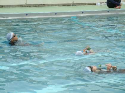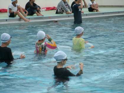 服のままプールに入った子ども達からは、「重い!」「いつもと違って自由に動かれへん。」などの声が聞かれました。プールの中を歩いたり、浮いたり、バタ足をしたりと、水着なら平気でできることでも、服を着た状態では大変だということを感じていました。そこで、自分の命を守るためにはどうすればよいか。むやみに手足を動かさず、ペットボトルなどを使って浮くことが大切だということを身をもって学習しました。