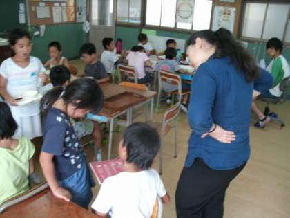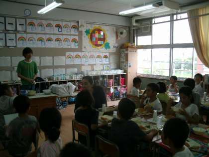 今日の給食の時間、5・6年生の外国語を教えてくださっているエイドリアン先生が2組にやってきました。どのグループの席に座るかじゃんけんで決めましたが、勝った班は大喜び。とても人気者のエイドリアン先生でした。