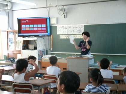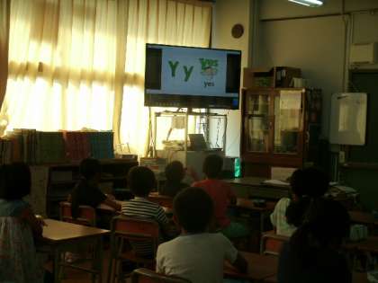 今学期から英語のモジュール学習が始まりました。毎週火曜日の朝学習の時間を使い、大型テレビを視聴したり、手をたたいたり、足ふみをしたりと体も使いながら、短時間ですが、こつこつと学習してきました。