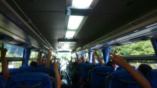バスで移動中です。三択クイズやカラオケ大会、なぞなぞなど、楽しい一時を過ごしています。係の人がしっかり準備してくれていて盛り上がっています。もうすぐ植村直己冒険館に着きます。