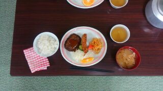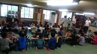 夕食を食べています。このあとのキャンプファイヤーに備えてしっかり食べてほしいです。