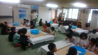 うどん作りです。7〜8人が協力して作ります。きれいに手を洗った後、どこも触ってはいけません。つい髪を触ってしまうなど大変でした。