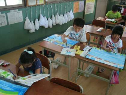1学期に大和川に行き、下絵を描いて色を塗り始めました。でも、夏休みに入ってしまい、中断していました。