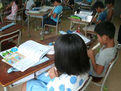 音楽の時間に笛の練習をしました。これまでは、『ソ』『ラ』『シ』『ド』という中〜高い音を吹いていましたが、今日は低い『ド』『レ』にチャレンジしました。低い音は、リコーダーの穴をしっかりと隙間なく押さえ、優しく息を吹かないと、すぐに「ピーッ」と鳴ってしまうのでとても難しいです。吹き始めは、案の定、多くの子ども達が「ピーッ」と鳴らしていました。しかし、担任から息の吹き方や穴の押さえ方のアドバイスを受け、練習を重ねていくと、だんだんときれいな音を出せるようになりました。