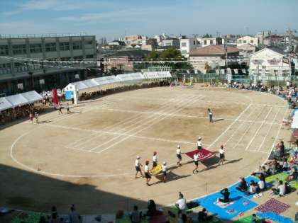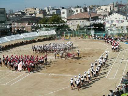 ピストルの合図のあと、運動会の幕明けを告げるファンファーレが鳴り響きました。第47回矢田東小学校運動会が開幕しました。