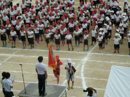 『おわりのたいそう』の後、閉会式が行われました。「赤組250点、白組212点。よって、優勝は赤組です。」と発表された時、赤組は大喜び。白組はその健闘に大きな拍手を送っていました。そして校長先生から、赤組には優勝旗、白組には準優勝楯が送られました。