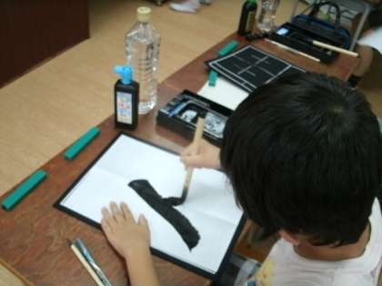 二画の字で簡単そうですが、これまでの直線ばかりの字と違い、少し曲がりがあります。また、はらいもあって、バランスがとりにくい字です。しかし、子ども達はお手本をよく見て、大きく力強く書いていました。